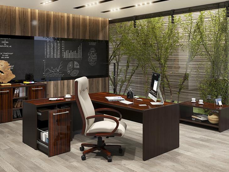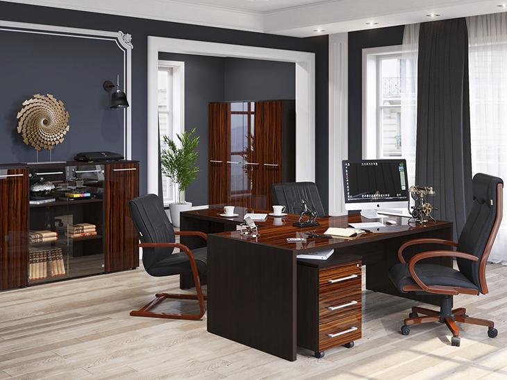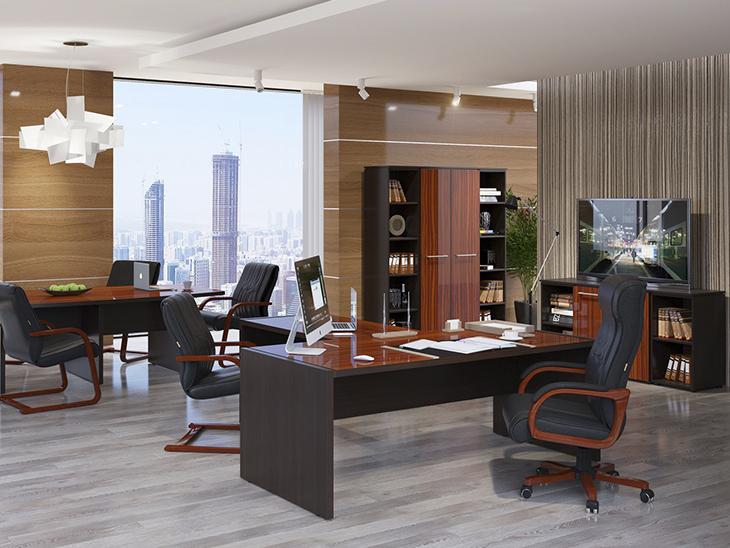 Стол руководителя, тумба сервисная, брифинг-приставка, шкаф для документов, гардероб.